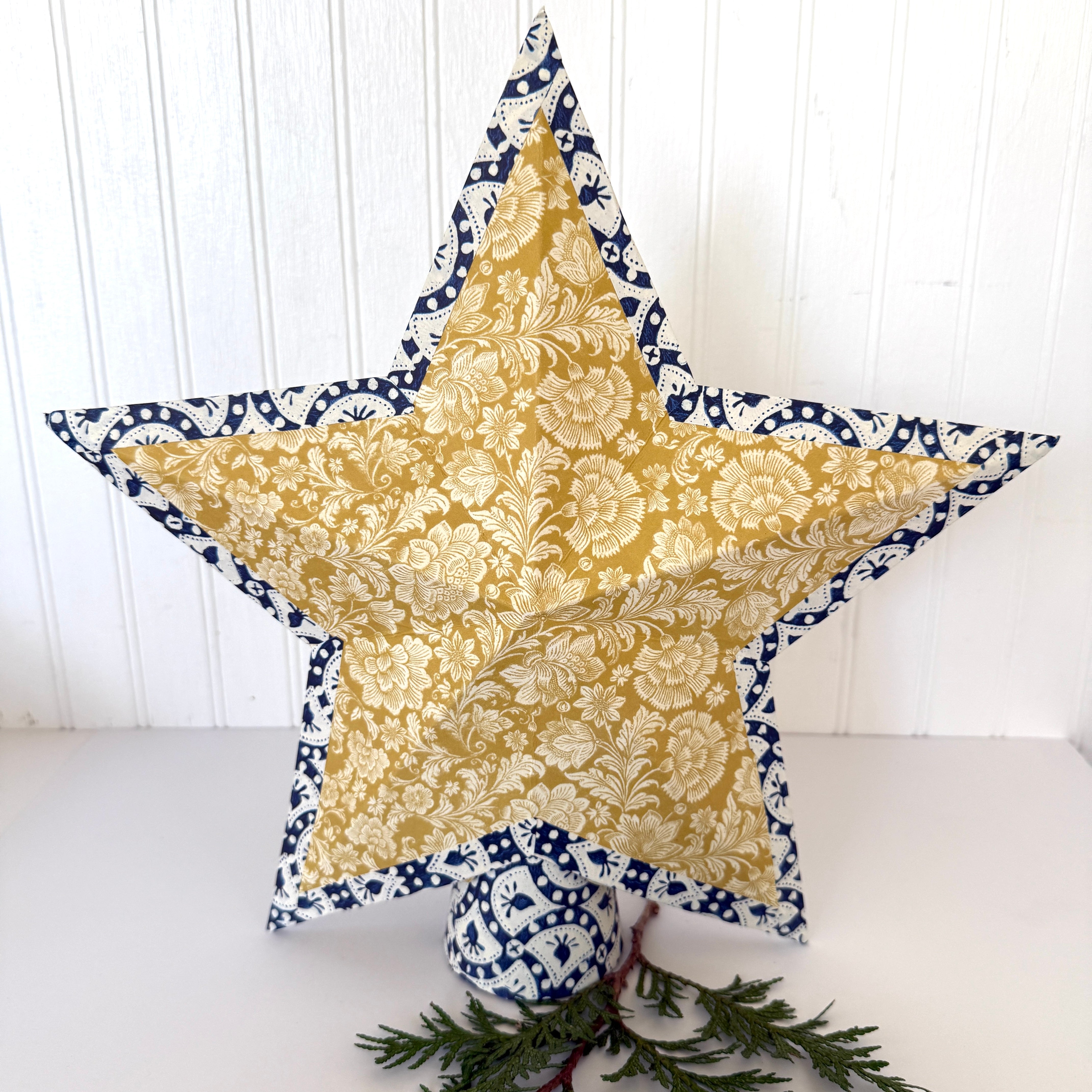The 3 dimensional star is an elegant addition to the top of your tree! The star is completely hand constructed from heavy paper, finished with decorative paper and trimmed with a contrasting paper border. It is mounted on a heavy board cone, also wrapped in a coordinating paper. The star may embellish the top of your tree, mantle or tabletop!