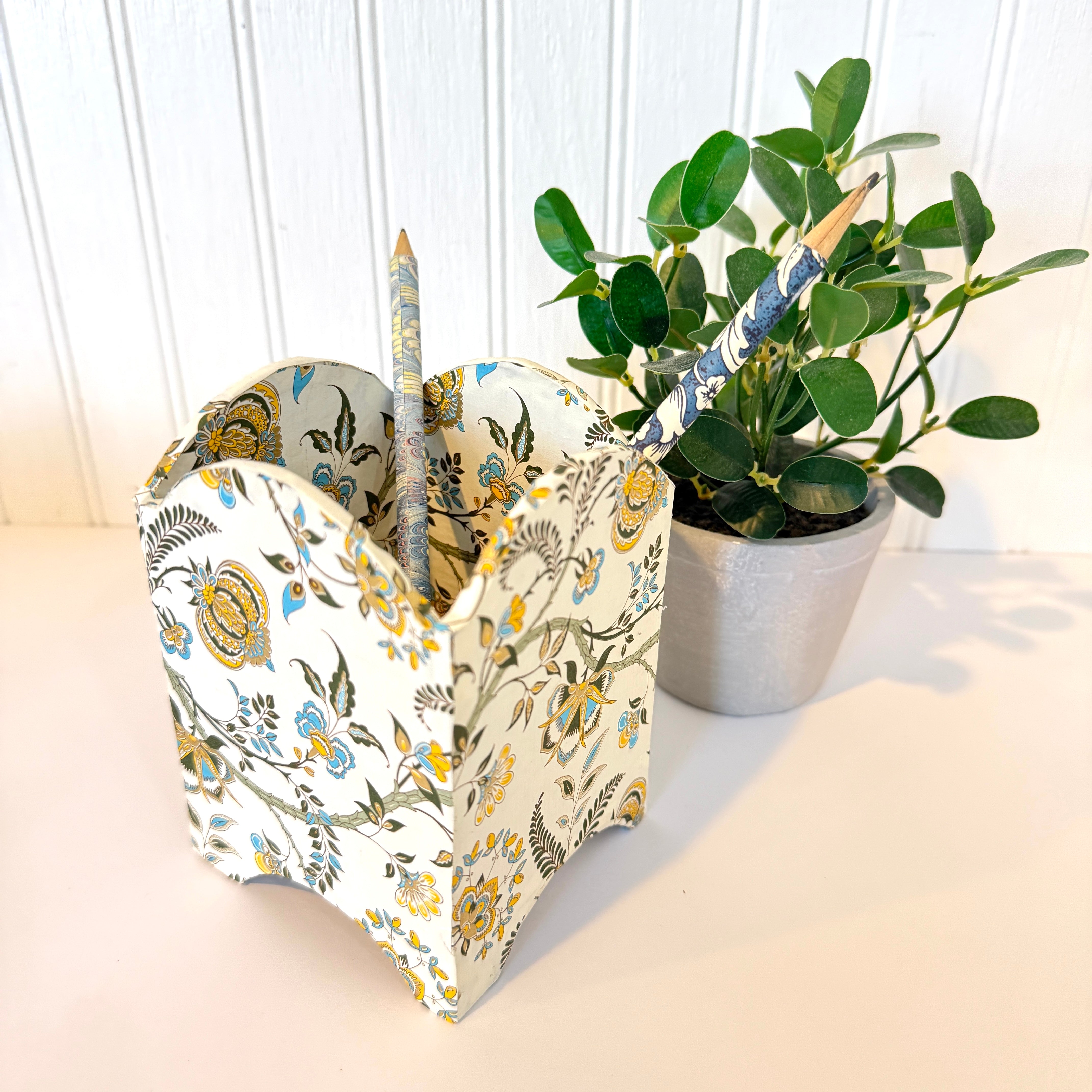Each bespoke pencil cup is completely bench made by hand. Acid free book board is meticulously cut and assembled then hand wrapped in the finest paper. size: 3" x 4 tall