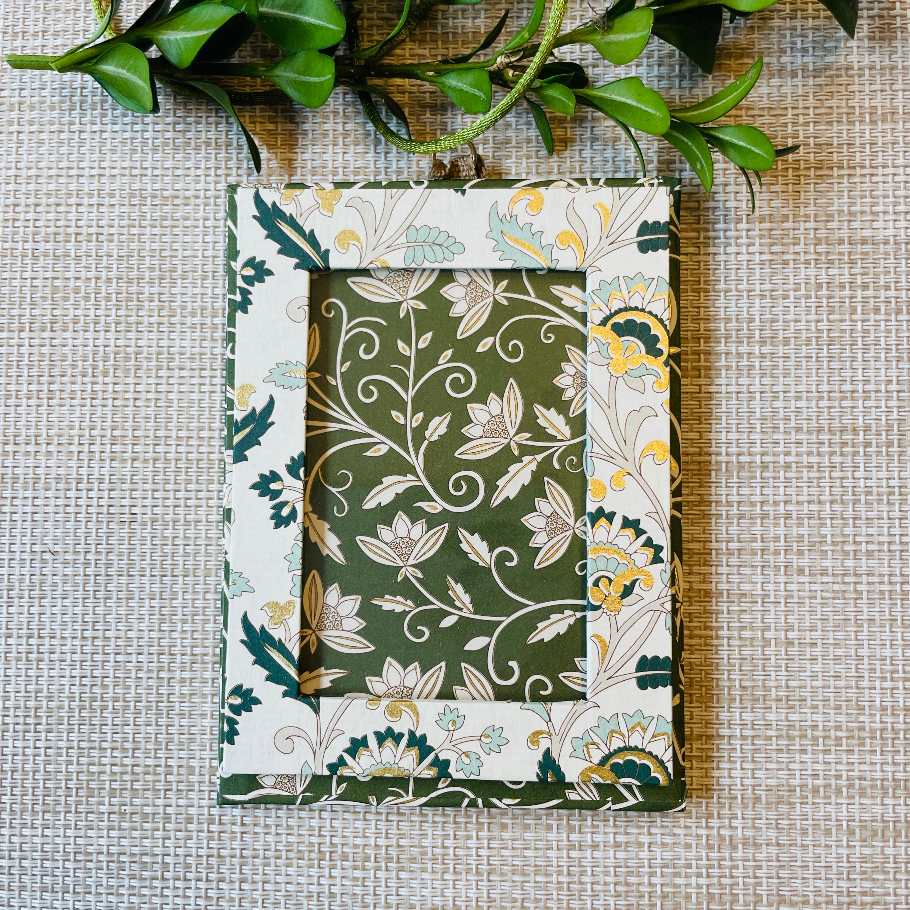 Petite hanging frame for your holiday tree, wreath or garland. Made completely by hand from gorgeous Italian and British papers. Frame holds 2 3/4" x 4" photo (opening is 2 1/8" x 3 1/2". Simply slide your photo through the top opening. Clear poly sheet covers your photo.