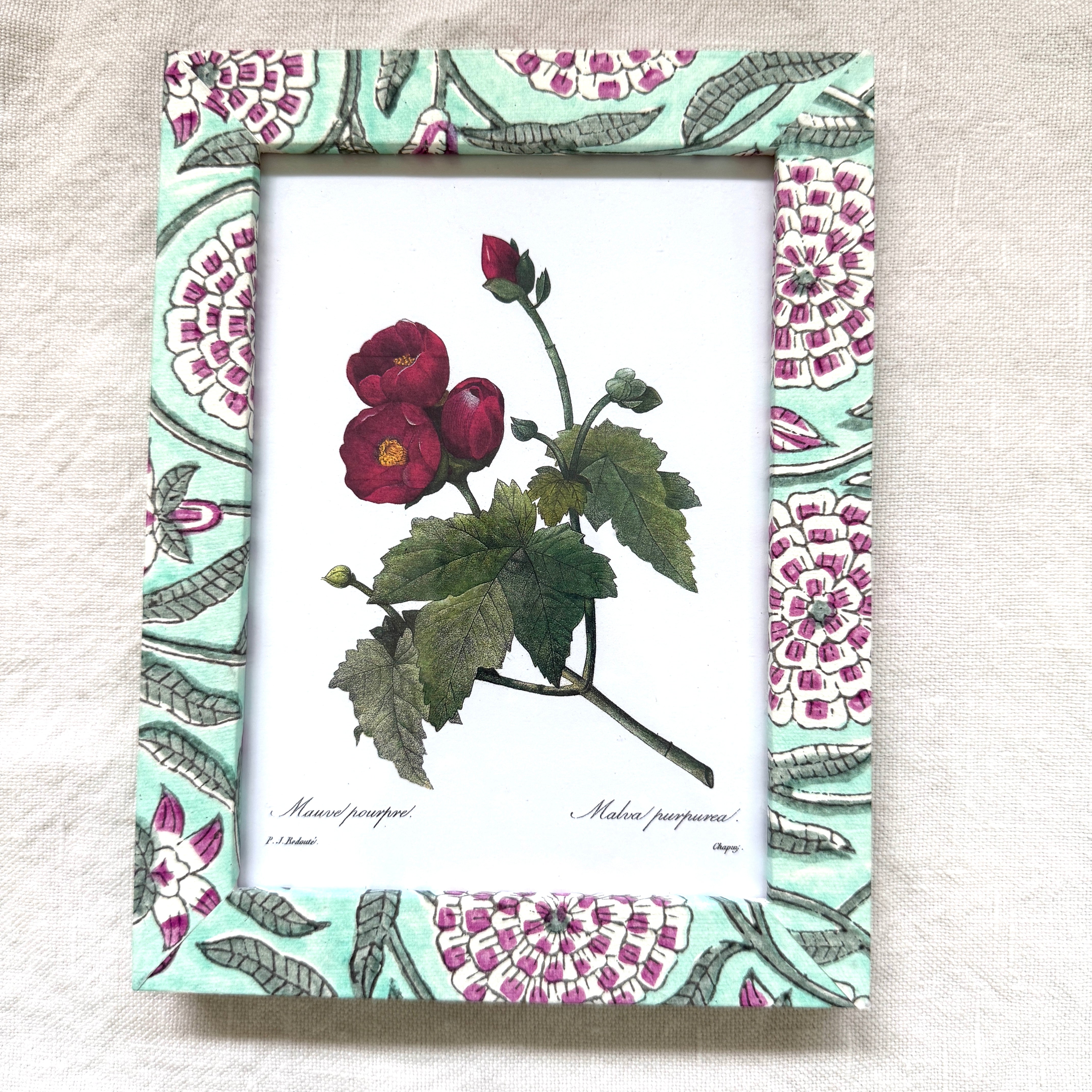 Sweet 5"x7" standing frame with digital botanical. Made completely by hand from gorgeous Italian and British papers. Frame holds 5" x 7" print or photo with glass.